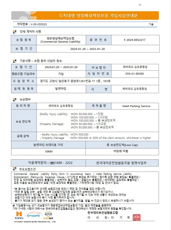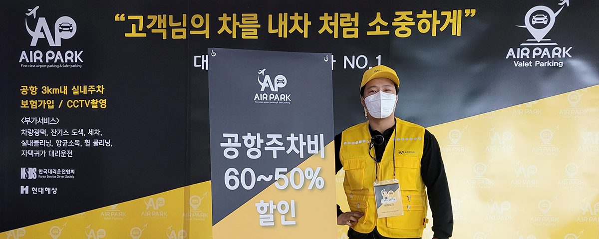 혹시모를 사고에 대비하여 전직원은 배상보험에 가입되어 있습니다 주차 스트레스 없는 편안한 여행의 시작을 도와드립니다. 우리는 많은 회사와 협력관계를 맺고 많은 부가서비스 및 혜택을 제공하고자 노력하고 있습니다. 15년 이상의 경험이 있는 전문 주차대행 직원이 있는 AIR PARK는 믿을 수 있습니다. 주차장에 직접 주차 후 셔틀 이용, 편리한 장소에서 주차대행 의뢰, 편의성을 감안한 완벽한 주차장을 준비하고 고객님을 기다리고 있습니다